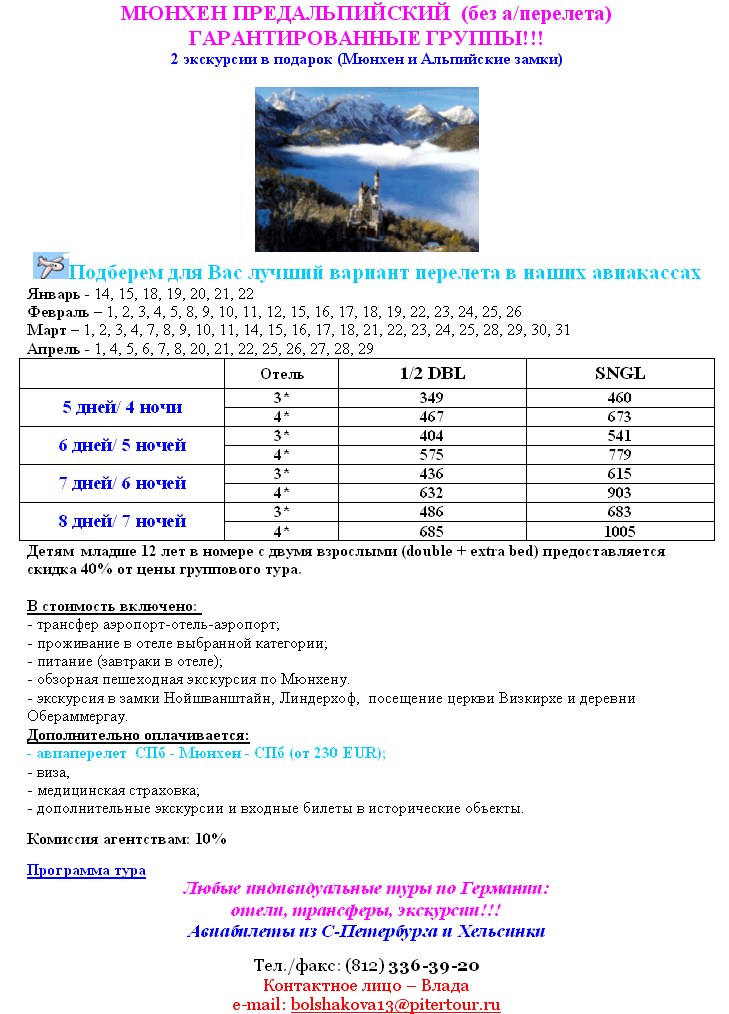 10 Янв 2012 12:48:48 ГЕРМАНИЯ Мюнхен предальпийский от 349 евро от фирмы ПИТЕРТУР