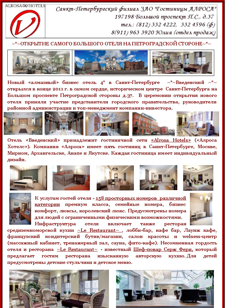 18 Янв 2012 17:24:35 РОССИЯ - Санкт-Петербург - Новый Отель 4* "ВВЕДЕНСКИЙ" на Петроградской стороне от фирмы ALROSA HOTELS