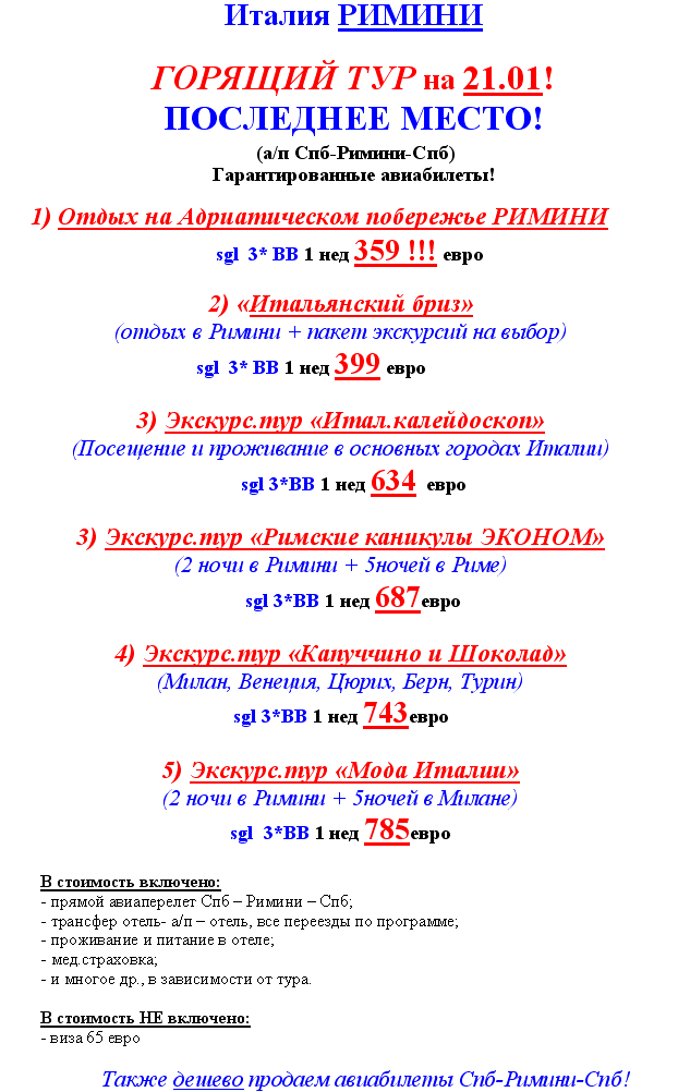 19 Янв 2012 23:16:37 ИТАЛИЯ РИМИНИ 21.01 от 359 евро, Последнее место от фирмы ИНТУРИСТ
