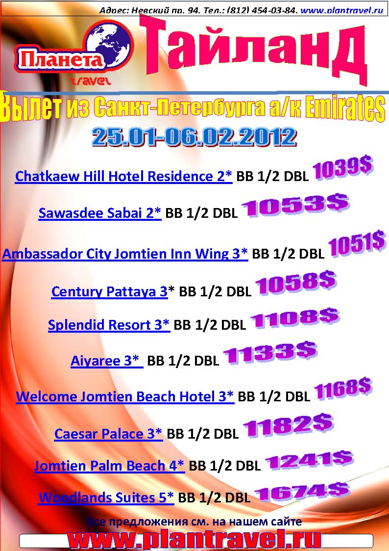 20 Янв 2012 11:35:34 ТАИЛАНД из Спб от 1039$ Вылет 25.01.2012 от фирмы ПЛАНЕТА TRAVEL