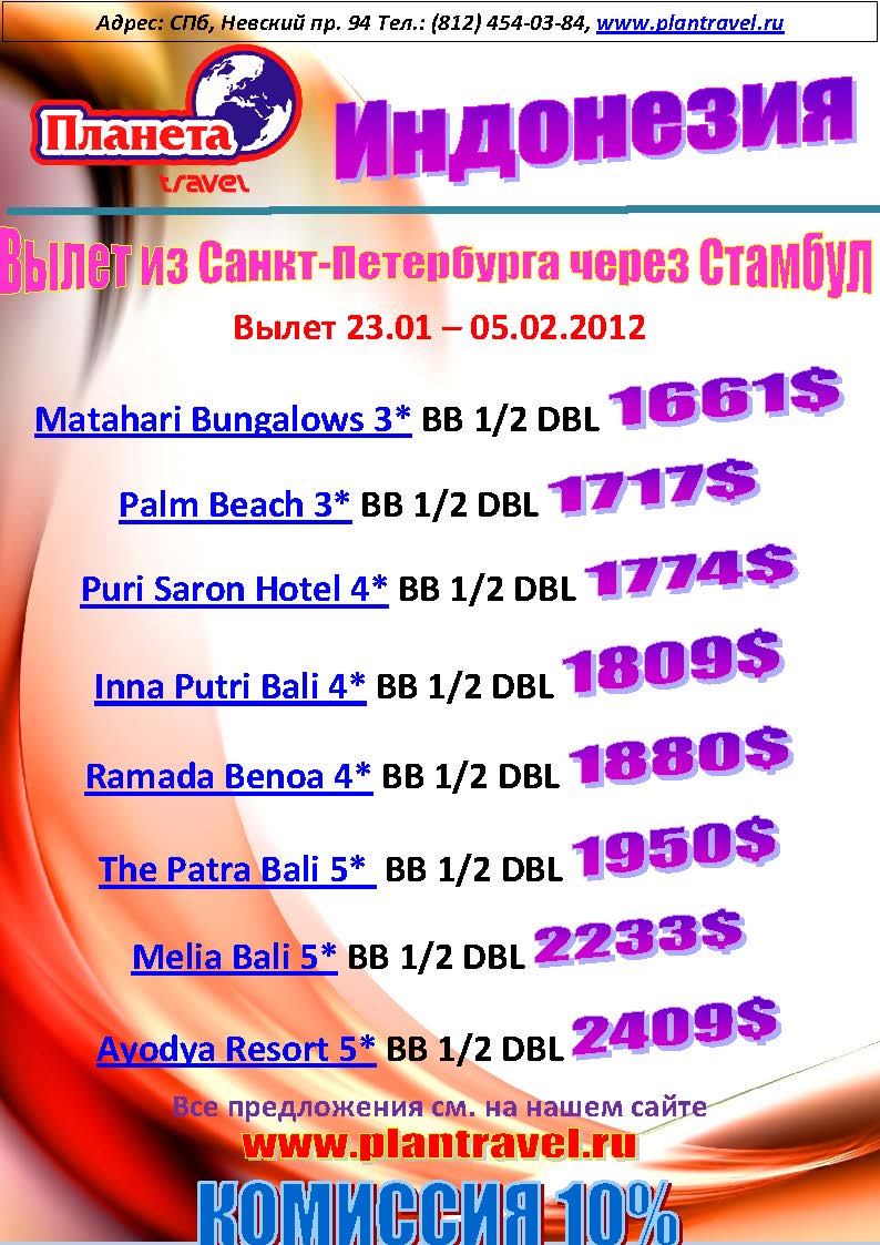 20 Янв 2012 12:05:43 ИНДОНЕЗИЯ из СПб от 1661$! Вылет 23.01.2012 от фирмы ПЛАНЕТА TRAVEL
