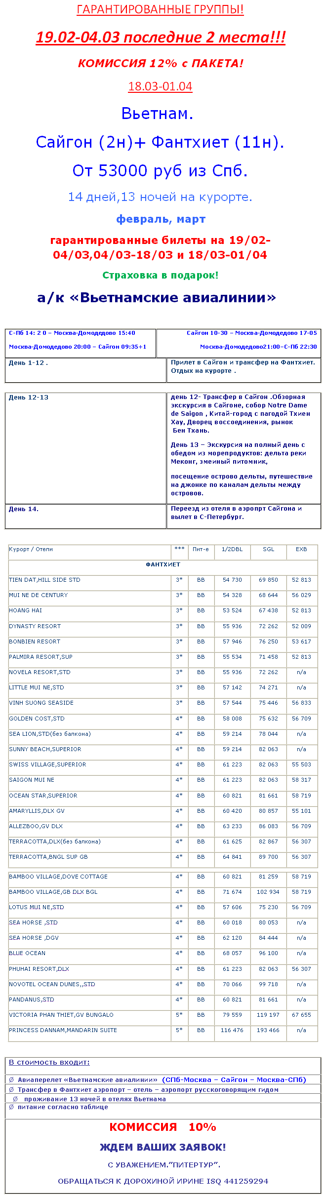 01 Фев 2012 15:26:24 ВЬЕТНАМ 18.03-01.04 Сайгон + Фантхиет от 53 000 руб из СПб от фирмы ПИТЕРТУР