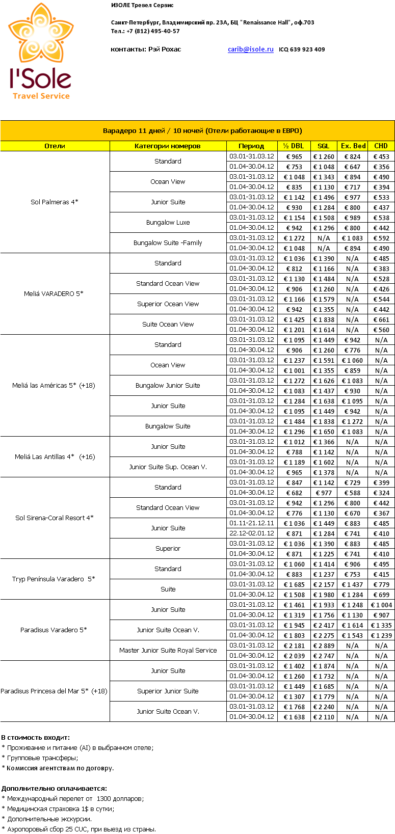 27 Фев 2012 12:36:44 КУБА Варадеро 11 дней / 10 ночей (Отели работающие в ЕВРО) от фирмы ISOLE TRAVEL SERVICE