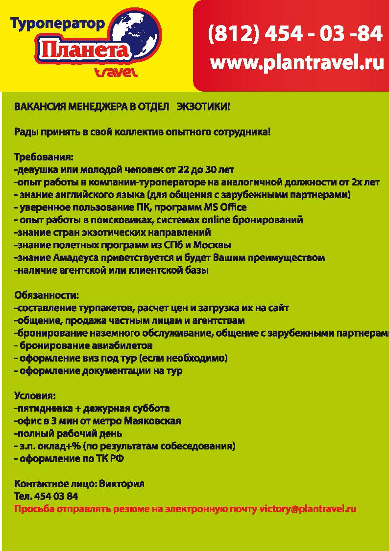 ВАКАНСИЯ менеджера в отдел экзотики от фирмы ПЛАНЕТА TRAVEL |