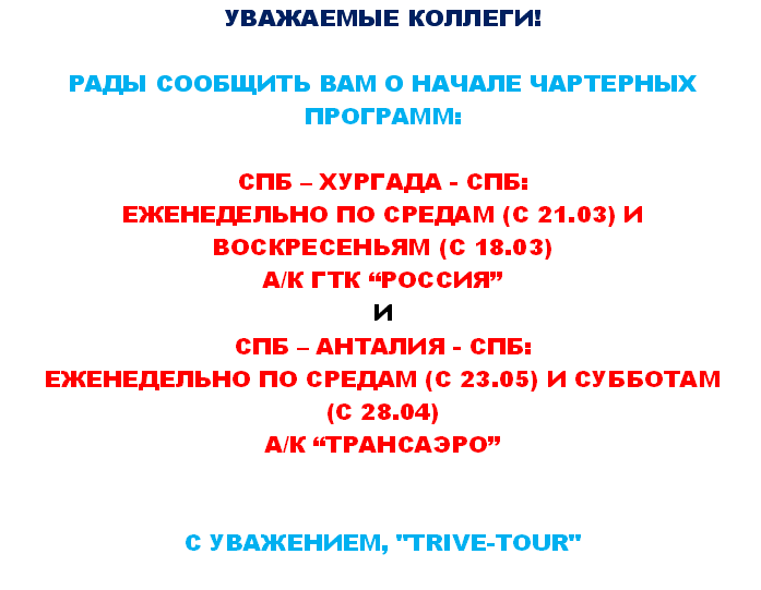 ЕГИПЕТ, ТУРЦИЯ. ЧАРТЕРНЫЕ ПРОГРАММЫ от фирмы TRIVE ТУР |