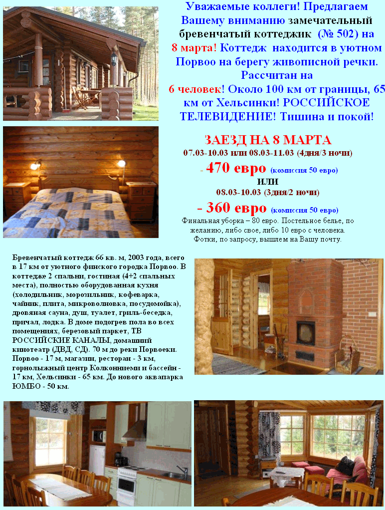 03 Мар 2012 22:43:52 ФИНЛЯНДИЯ - УЮТНЫЙ КОТТЕДЖ 502 НА 8 МАРТА! РЯДОМ С ГРАНИЦЕЙ на 6 ЧЕЛОВЕК от фирмы БЮРО ПУТЕШЕСТВИЙ