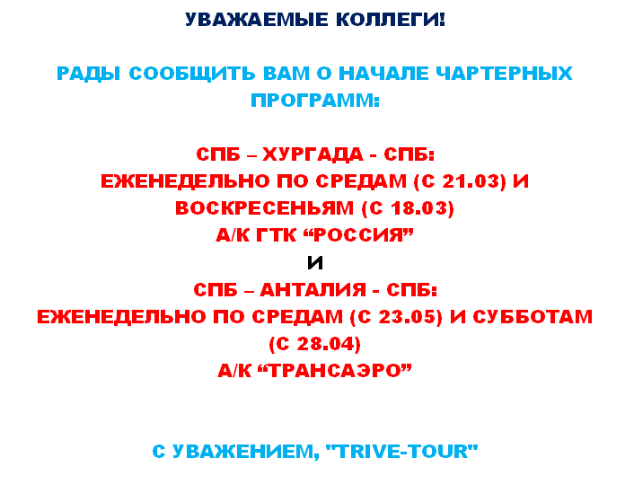 ИНФО - ЧАРТЕРНЫЕ ПРОГРАММЫ от фирмы TRIVE ТУР |