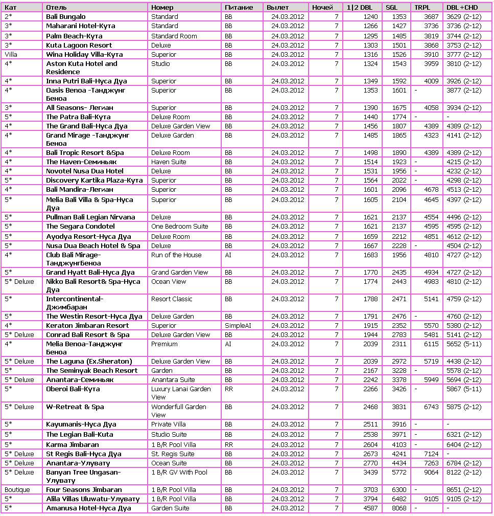 проживание на о.Бали в выбранном отеле на базе указанного
