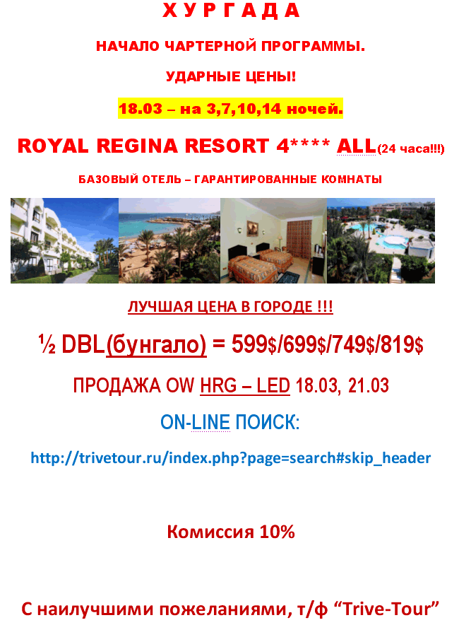ЕГИПЕТ - ХУРГАДА 18.03 на 03/07/10/14н - гарант. комнаты от фирмы TRIVE ТУР |