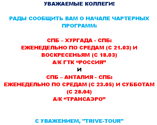 ТУРЦИЯ и ЕГИПЕТ - Начало ЧАРТЕРНЫХ ПРОГРАММ от фирмы TRIVE ТУР |