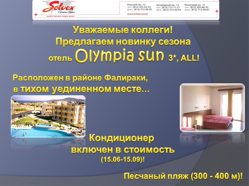 ГРЕЦИЯ. РОДОС. НОВИНКА СЕЗОНА ОТЕЛЬ OLYMPIA SUN 3*,ALL от фирмы СОЛВЕКС |