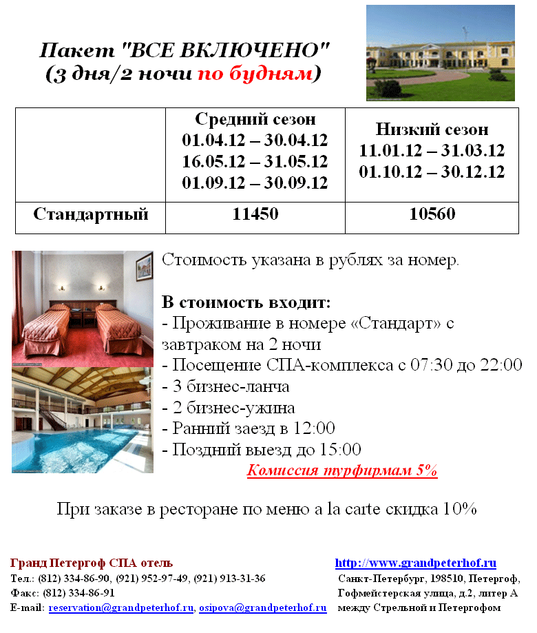 РОССИЯ - ПЕТЕРГОФ, пакет "Все включено" от фирмы ГРАНД ПЕТЕРГОФ СПА ОТЕЛЬ |