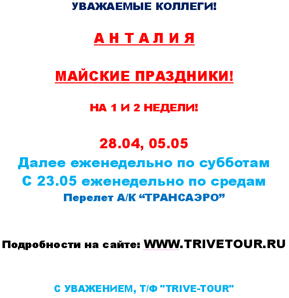 ТУРЦИЯ Анталия на майские праздники 28.04, 05.05 - на 1/2 нед от фирмы TRIVE ТУР |
