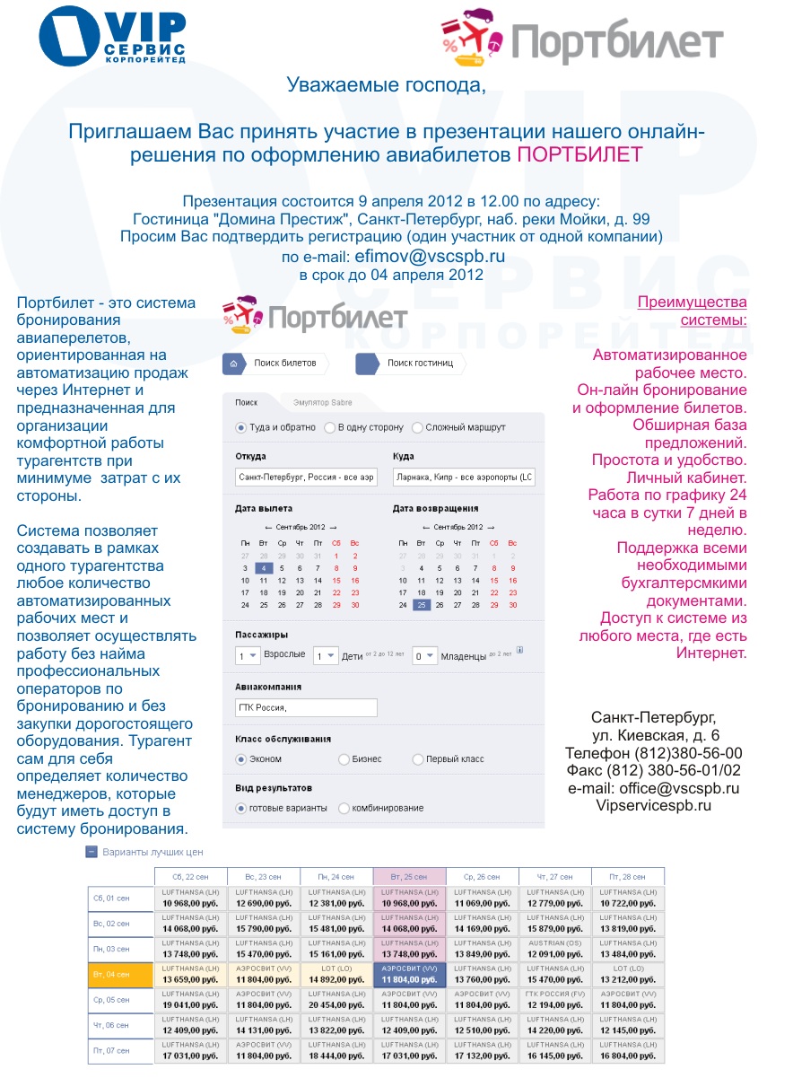 02 Апр 2012 18:59:05 СЕМИНАР 09.04 "ПОРТБИЛЕТ" - онлайн решение по оформлению авиабилетов - от фирмы VIP СЕРВИС