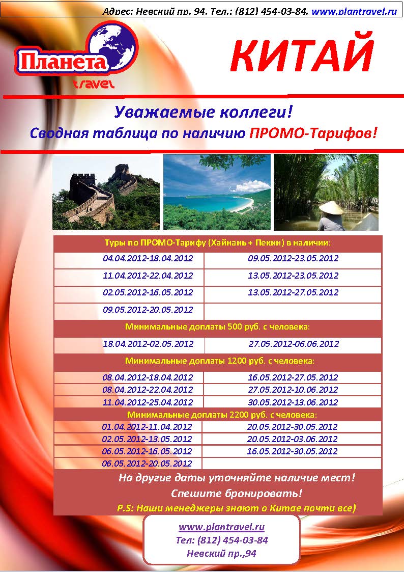 05 Апр 2012 16:13:10 КИТАЙ Сводная таблица по наличию Промо-ТАРИФА (Хайнань + Пекин) от фирмы ПЛАНЕТА TRAVEL