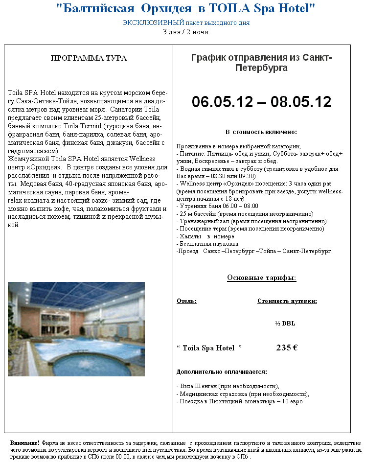 ЭСТОНИЯ 06.05-08.05 Балтийская Орхидея в TOILA Spa Hotel от фирмы EUROPE-TOUR |