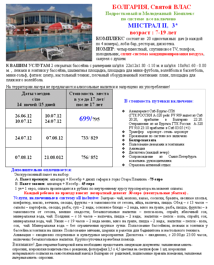 подростково -молодежный лагерь МИСТРАЛ 2, категории 3* в Болгарии, южное побережье, курорт