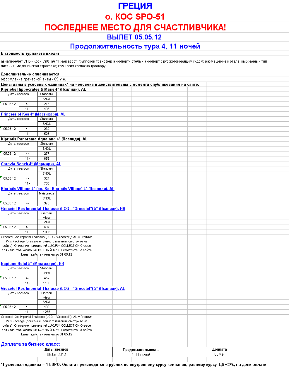 ГРЕЦИЯ - КОС ВЫЛЕТ 05 МАЯ ПОСЛЕДНЕЕ МЕСТО ДЛЯ СЧАСТЛИВЧИКА ОТ 218 У.Е. от фирмы ЮЖНЫЙ КРЕСТ |