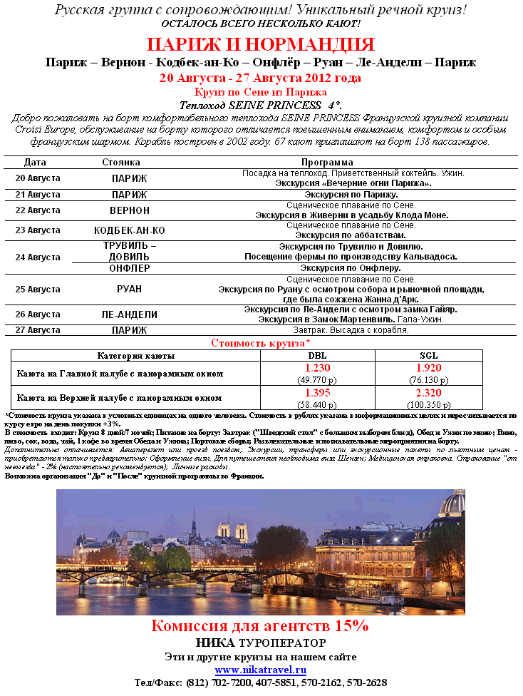 20 Май 2012 16:19:15 ЕВРОПА 20.08-27.08 Круиз по Сене ПАРИЖ и НОРМАНДИЯ, Русская группа, т/х SEINE PRINCESS 4* от фирмы НИКА
