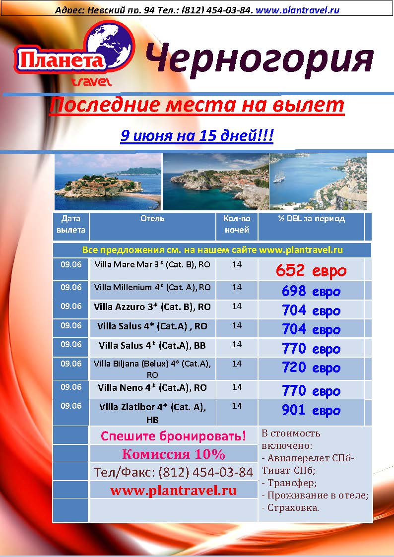 29 Май 2012 12:13:38 ЧЕРНОГОРИЯ. ПОСЛЕДНИЕ МЕСТА на 09.06 от 652 евро от фирмы ПЛАНЕТА TRAVEL