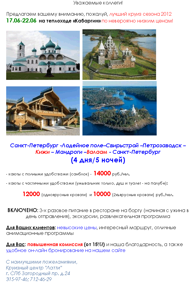 31 Май 2012 17:28:11 КРУИЗ на КИЖИ 17.06-22.06 на т/х Кабаргин от фирмы КРУИЗНЫЙ ЦЕНТР ЛАТТИ