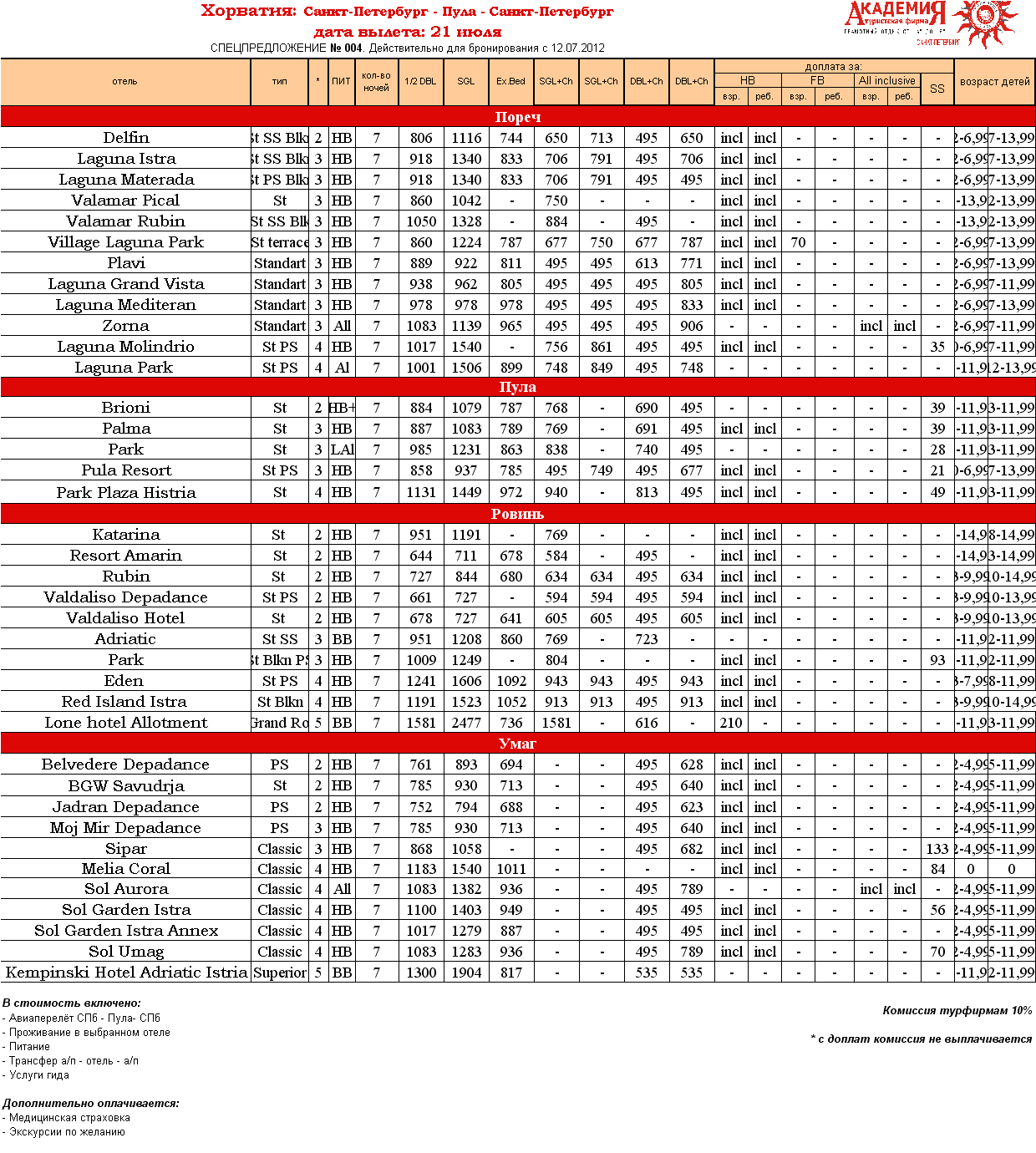 16 Июл 2012 13:51:19 ХОРВАТИЯ, Пула 21.07 на 7 ночей от фирмы АКАДЕМИЯ