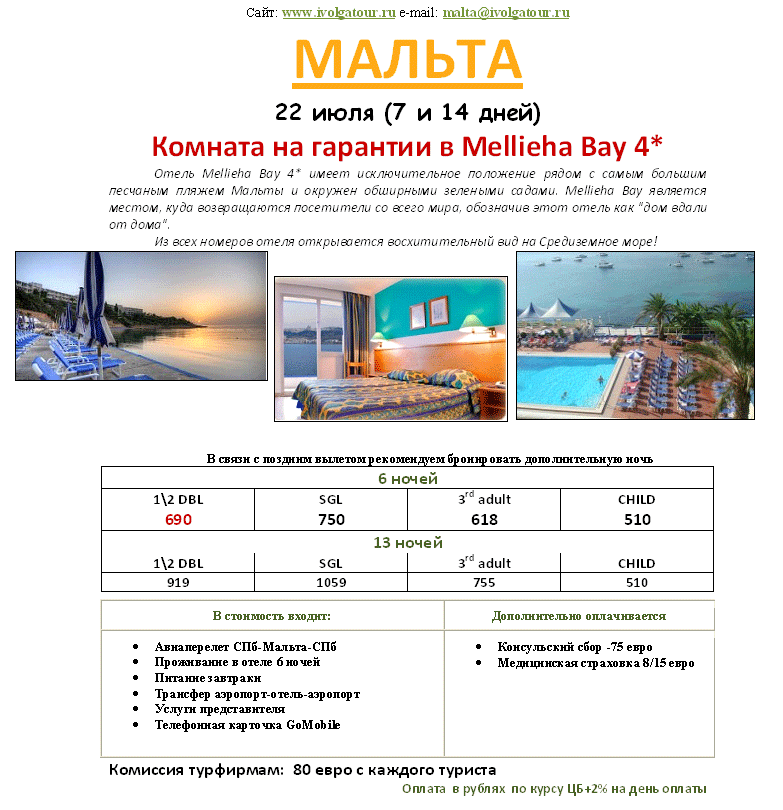 18 Июл 2012 10:53:27 МАЛЬТА, 22 июля (7 и 14 дней), Mellieha Bay 4* от фирмы ИВОЛГА