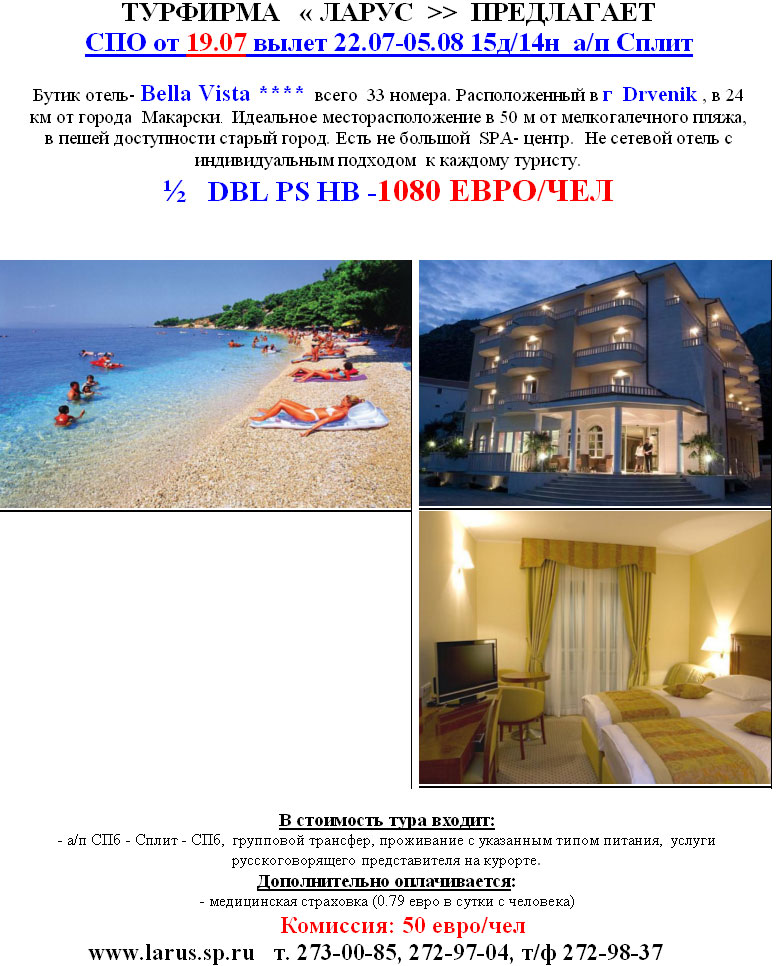 19 Июл 2012 15:00:27 ХОРВАТИЯ - Drvenik - Bella Vista 4* - 22.07-05.08 15д/14н - 1080 EUR/чел - а/п Сплит от фирмы ЛАРУС