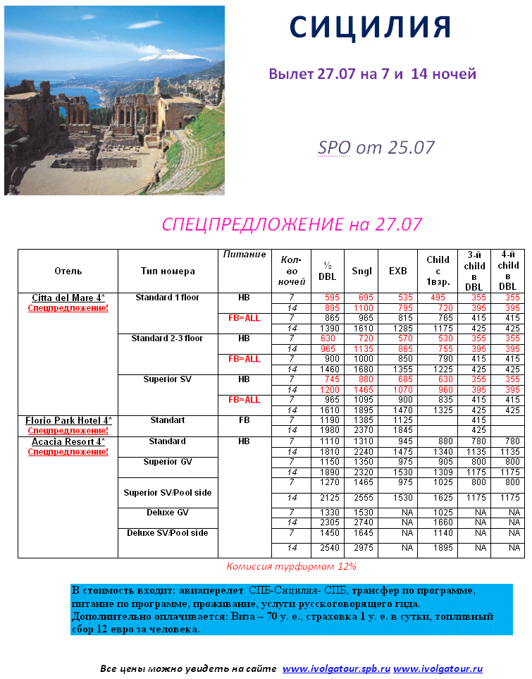 25 Июл 2012 12:08:34 ИТАЛИЯ - СИЦИЛИЯ 27.07 на 1 и 2 недели, 4* от 595 евро, Новое SPO от фирмы ИВОЛГА