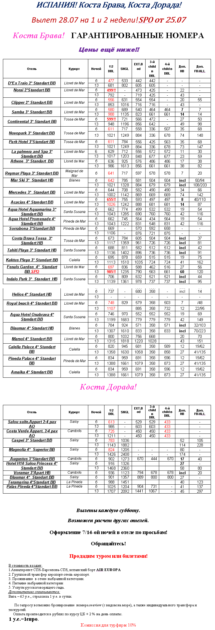27 Июл 2012 11:40:36 ИСПАНИЯ Коста Брава, Коста Дорада 28.07 на 1 и 2 недели от 477 евро - гарант. места - туром или билетами - от фирмы ИВОЛГА