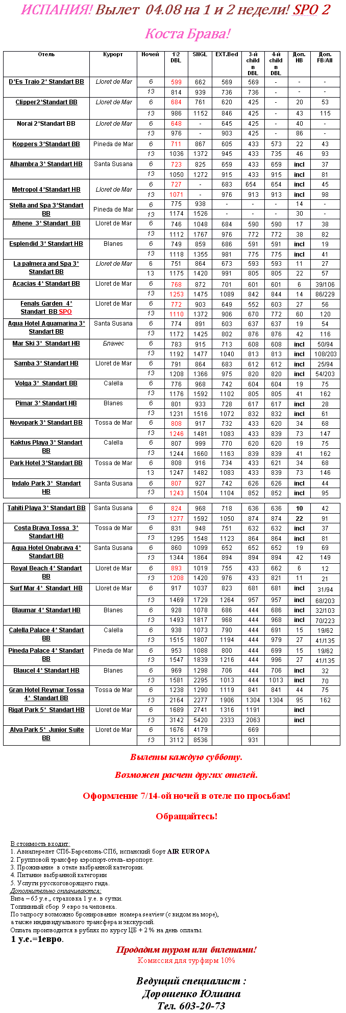 27 Июл 2012 11:45:44 ИСПАНИЯ Коста Брава 04.08 на 1 и 2 недели, туром или билетами - от фирмы ИВОЛГА