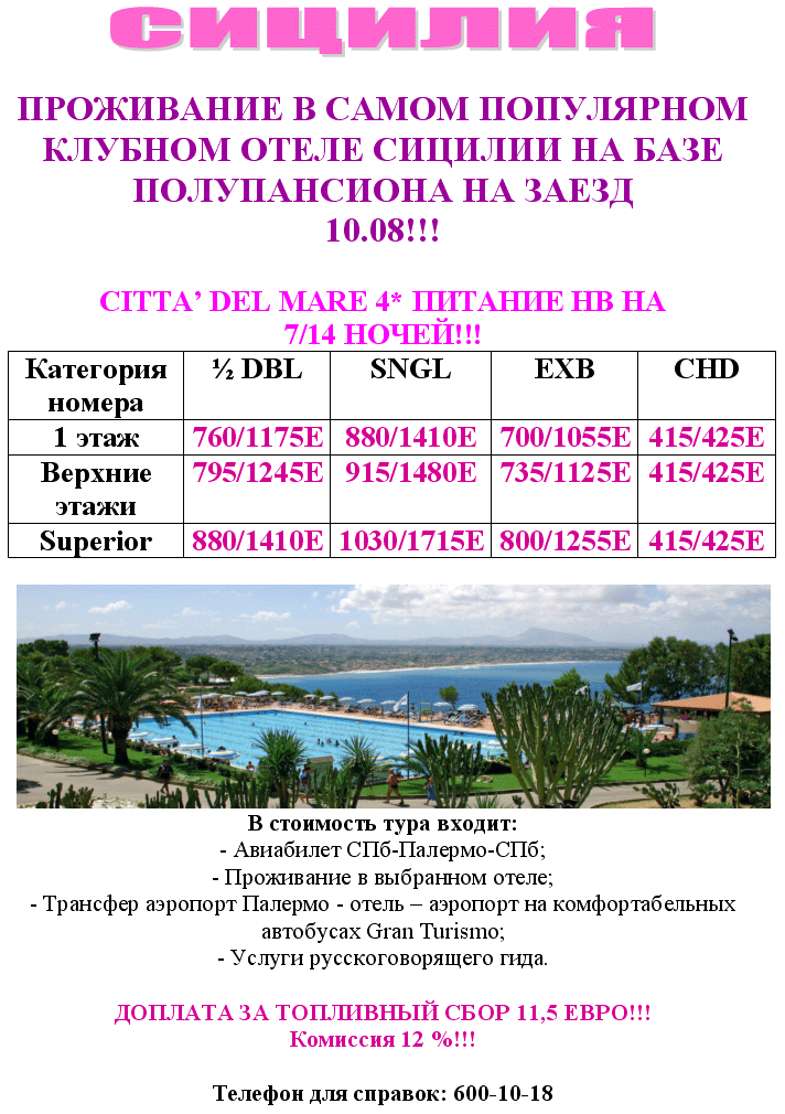 03 Авг 2012 18:16:25 ИТАЛИЯ Сицилия. 10.08, Citta del Mare 4*, Уникальное СПО на базе полупансиона от фирмы АВАТАРА