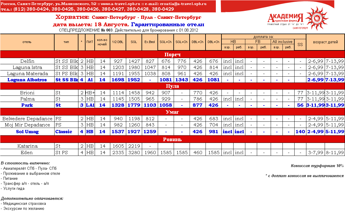 06 Авг 2012 13:43:32 ХОРВАТИЯ, Пула 18.08 14 ночей от фирмы АКАДЕМИЯ