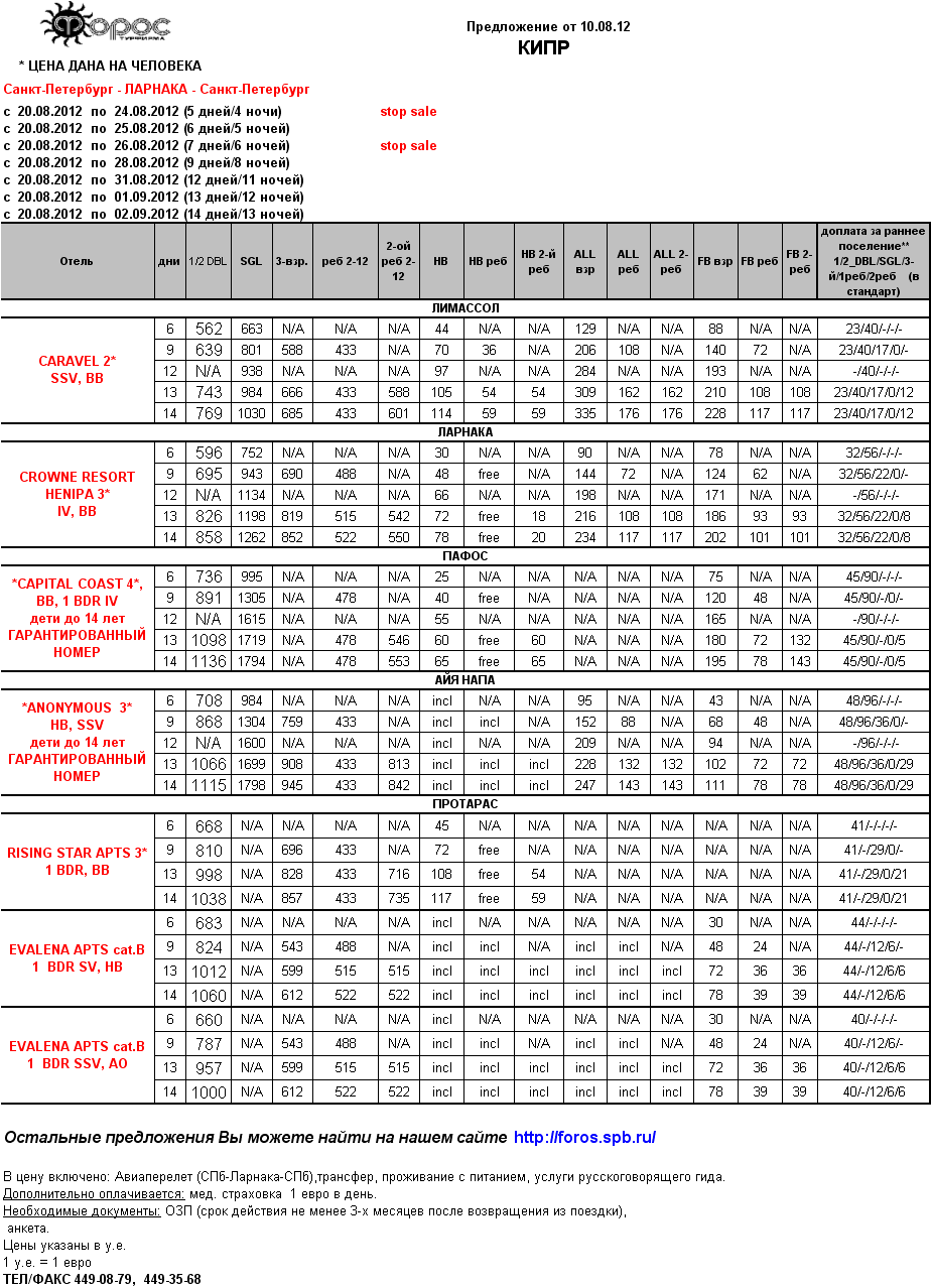 КИПР 20.08 - Снижение цен от фирмы ФОРОС |