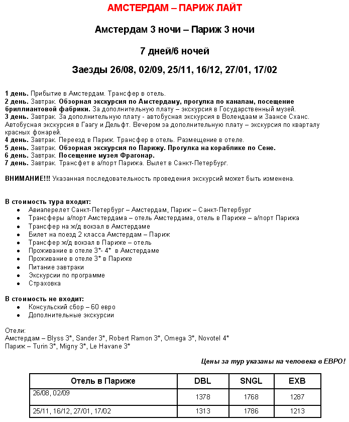 30 Авг 2012 12:05:32 НИДЕРЛАНДЫ-ФРАНЦИЯ "Лайт" 7дн/6н Амстердам-Париж от фирмы OOSTMARKT