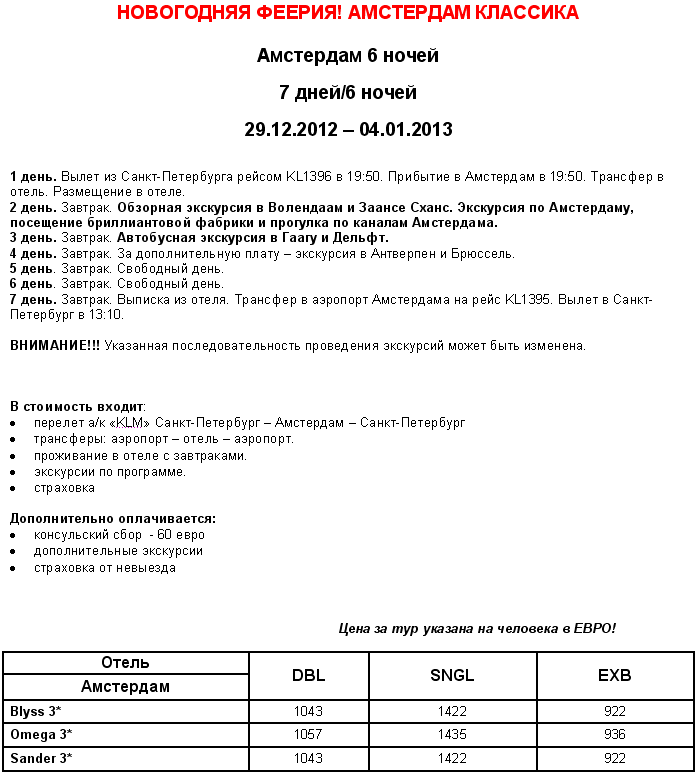 30 Авг 2012 12:00:12 НИДЕРЛАНДЫ 29.12-04.01 Амстердам Классика Новогодняя Феерия от фирмы OOSTMARKT