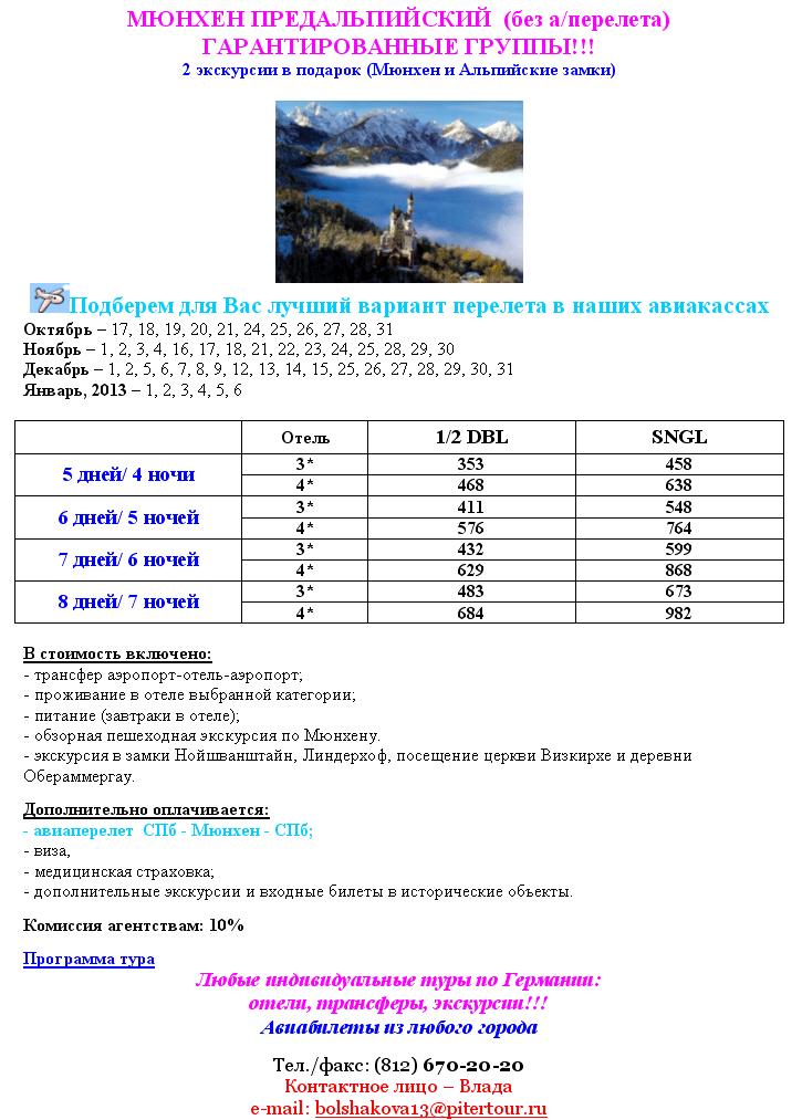 06 Сен 2012 14:12:01 ГЕРМАНИЯ Мюнхен предальпийский от 353 евро от фирмы ПИТЕРТУР