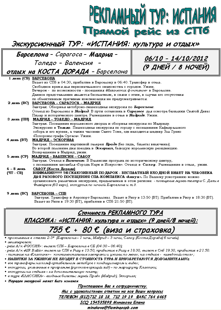 ИСПАНИЯ 06.10-14.10 Экскурсионный РЕКЛАМНЫЙ ТУР для сотрудников и членов их семей от фирмы ФЛАМИНГО