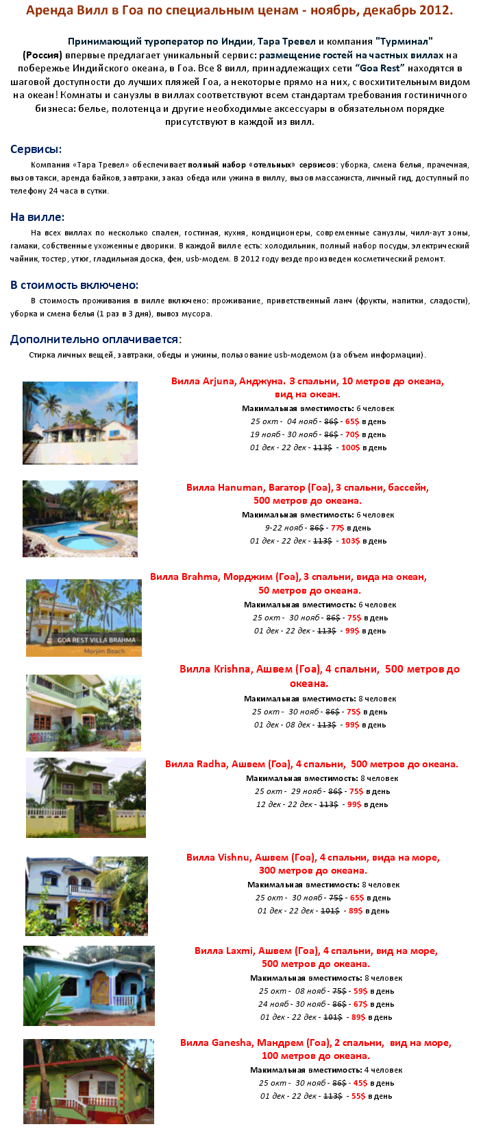 19 Окт 2012 12:00:02 ИНДИЯ - ГОА - аренда вилл в НОЯБРЕ и ДЕКАБРЕ от фирмы ТУРМИНАЛ ТРЭВЕЛ КОМПАНИ