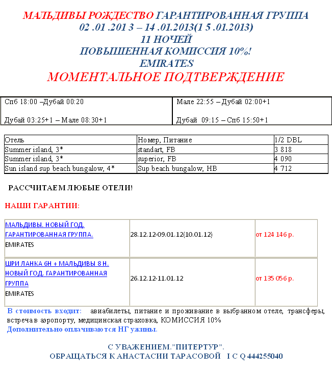 МАЛЬДИВЫ - РОЖДЕСТВО, ГАРАНТИРОВАННАЯ ГРУППА от фирмы ПИТЕРТУР |