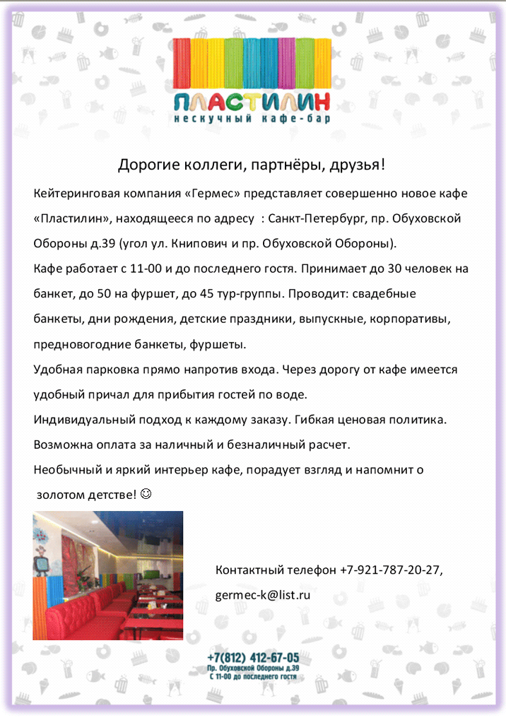 24 Окт 2012 18:03:21 РОССИЯ - СПб кафе-бар ПЛАСТИЛИН - приглашаем к сотрудничеству от фирмы GERMES CATERING