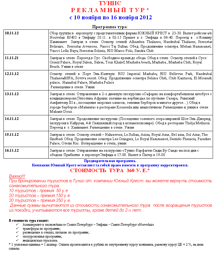 ТУНИС 10.11-16.11 РЕКЛАМНЫЙ ТУР от фирмы ЮЖНЫЙ КРЕСТ |