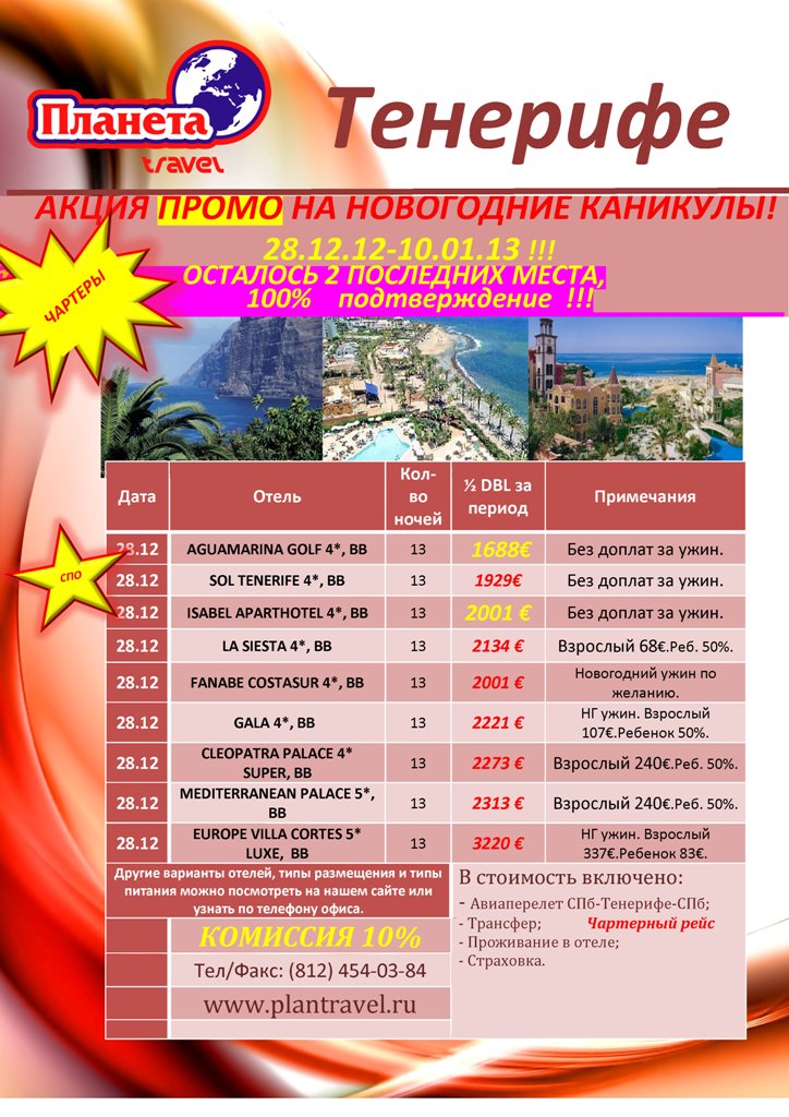 ИСПАНИЯ. ТЕНЕРИФЕ Новогодний Тур! Последние места 28.12.12-10.01.13 от фирмы ПЛАНЕТА TRAVEL |
