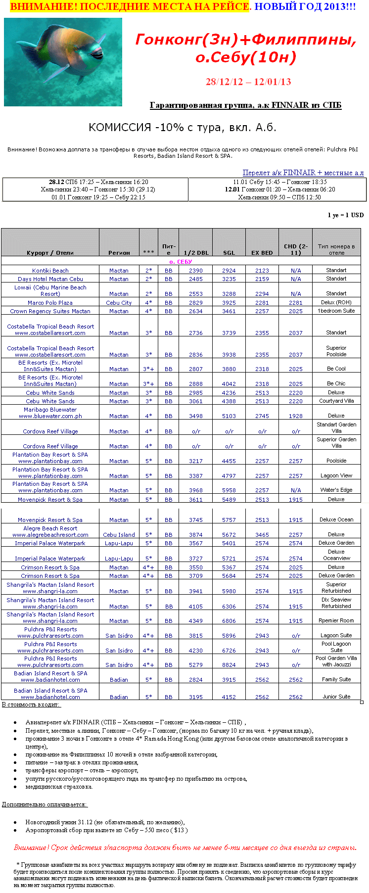 03 Дек 2012 12:30:45 ФИЛИППИНЫ Себу (10н) через Гонконг (3н) - 28.12 от 75 т.р. Новый год. Последние 4 места в группе от фирмы ПИТЕРТУР
