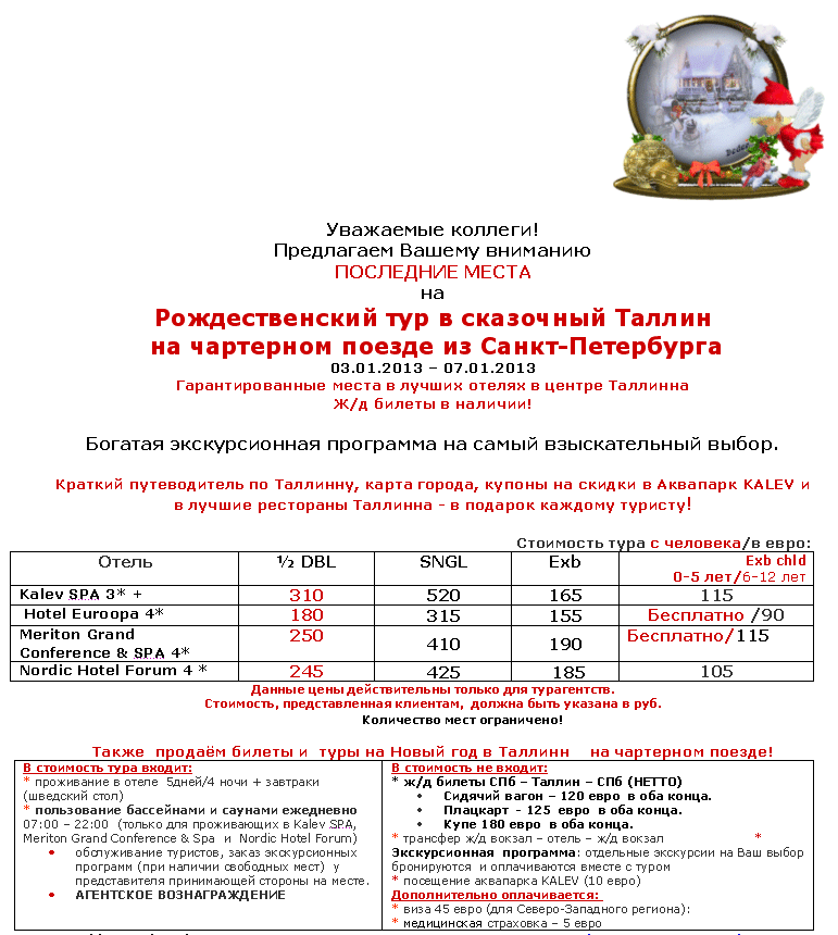 04 Дек 2012 15:15:23 ЭСТОНИЯ Таллин 03.01-07.01 на Рождество на чартерном поезде, гарант. места от фирмы РУССКИЙ ЭКСПРЕСС