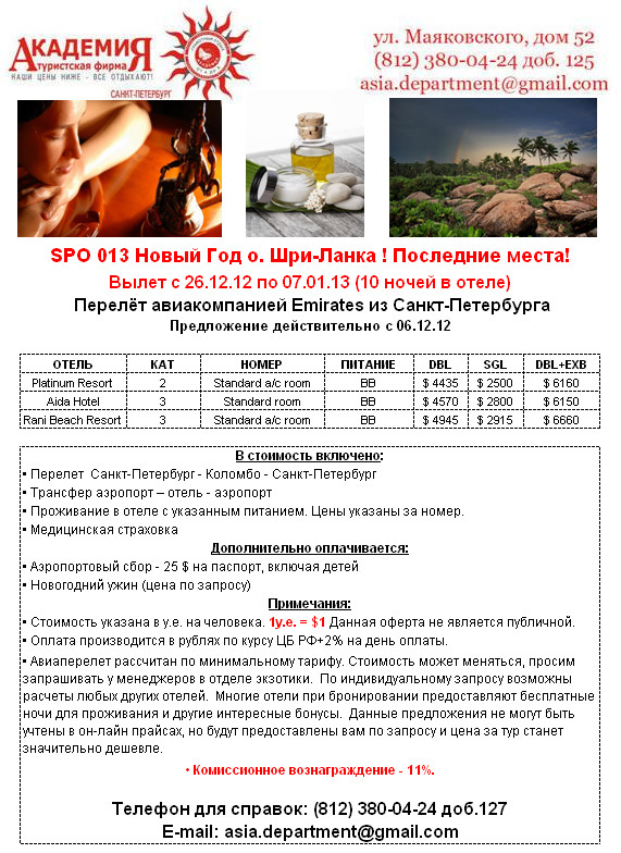06 Дек 2012 11:32:08 ШРИ-ЛАНКА. Новый Год 10 незабываемых ночей. Последние места от 2217$ от фирмы АКАДЕМИЯ