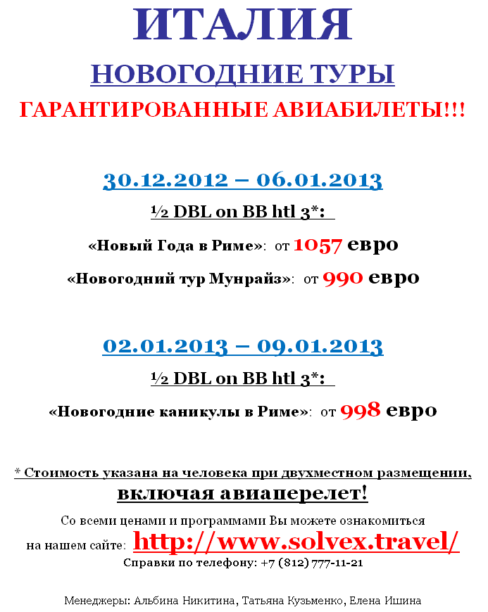 10 Дек 2012 11:50:37 ИТАЛИЯ, Новогодние туры с 30.12, 02.01 гарант. авиабилеты от фирмы СОЛВЕКС