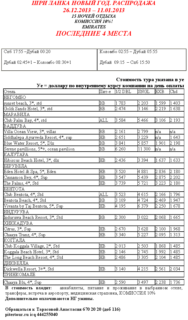 10 Дек 2012 13:18:01 ШРИ-ЛАНКА 26.12-11.01 отдых на Новый Год от 1783$ от фирмы ПИТЕРТУР