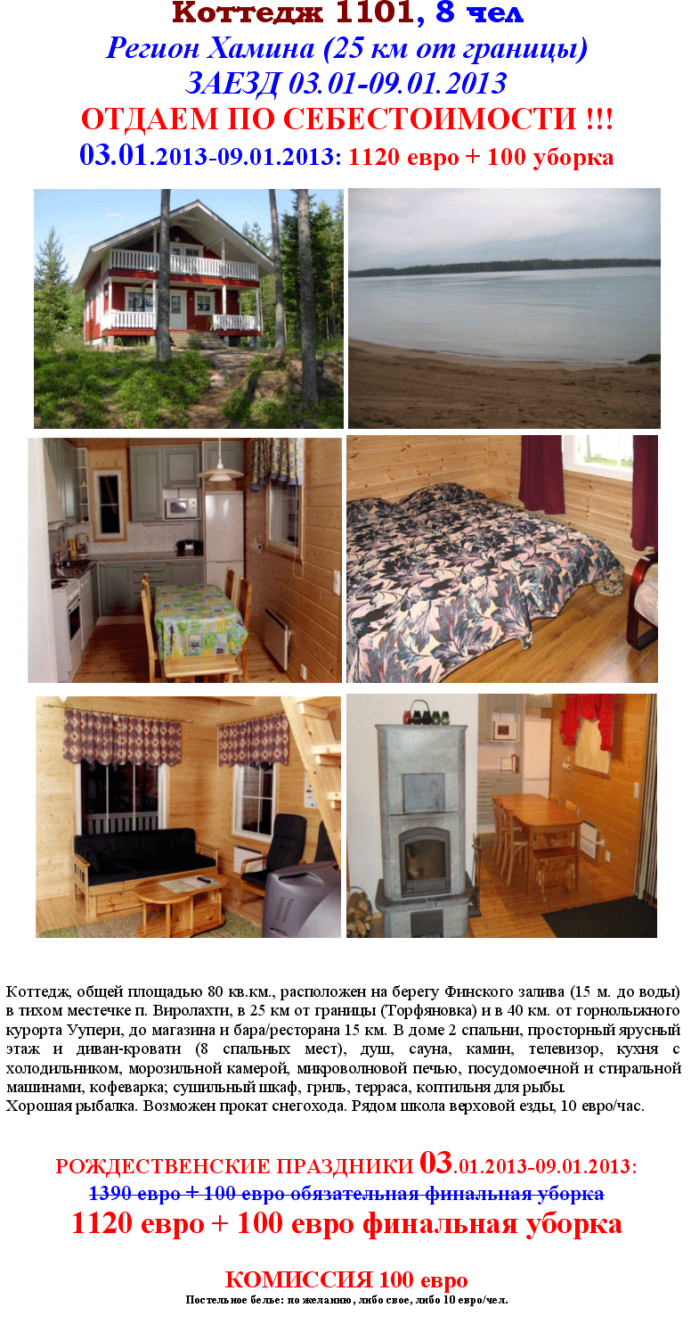 11 Дек 2012 11:06:53 ФИНЛЯНДИЯ - Хамина - Коттедж (8 чел) 03.01-09.01 за 1120 ЕВРО от фирмы БЮРО ПУТЕШЕСТВИЙ