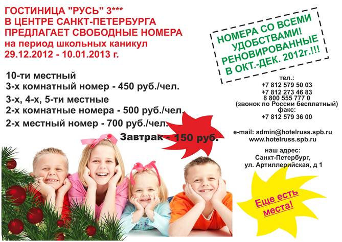 РОССИЯ - СПБ - гост. РУСЬ - РАЗМЕЩЕНИЕ в СПБ от 450 р. на ШКОЛЬНЫЕ КАНИКУЛЫ от фирмы ГОСТИНИЦА РУСЬ